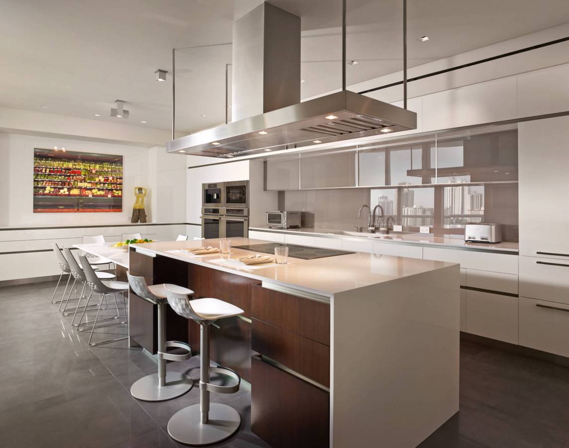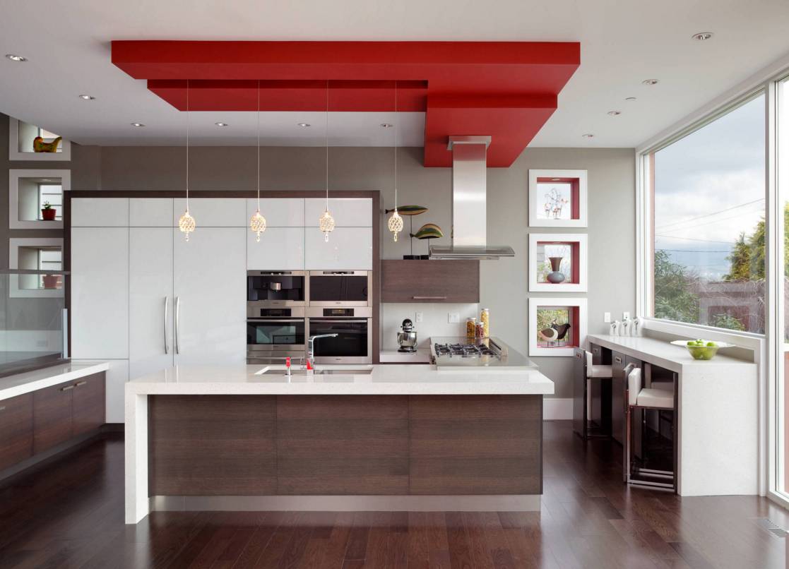 Современный стиль является довольно сдержанным в плане цветовой гаммы, основными цветами являются белый, черный и серый. В интерьер некоторых кухонь добавляют яркие акценты, но это небольшие участки среди спокойных цветов.