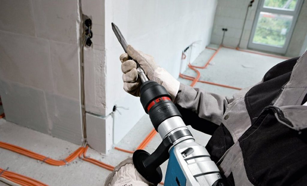 Для выполнения штробления этим инструментом нужны три насадки – два бура разной длины и лопатка. Сначала необходимо просверлить отверстия глубиной 2.5 см по всей длине намеченной линии. Они должны быть равномерно расположены на расстоянии 1-1.5 см друг от друга. Затем, сменив бур на лопатку, пройтись по борозде от точки к точке, образовывая сплошную канавку. Работать перфоратором можно быстро и чисто. И после окончания работ получится магистраль заданной глубины и ширины. А непривлекательный внешний вид впоследствии можно будет замаскировать шпатлевкой.