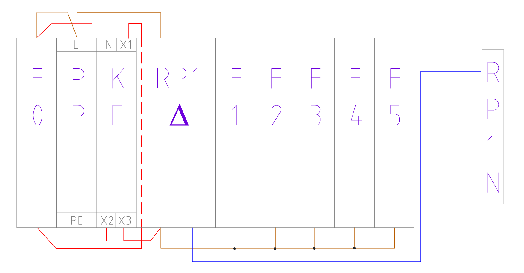 5. Предохранители по току (F1-F5) – через дифференциальный автоматический выключатель RP1. После монтажа DIN-рейки в распределительном устройстве фазные проводники отдельных цепей будут соединены с верхней стороны автоматических выключателей.