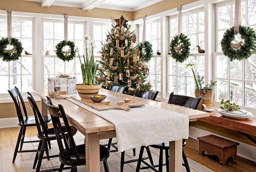 Не забывайте разместить на дверях венки, которые можно сделать собственноручно из искусственных или натуральных еловых веточек, высушенных ягод и других украшений.