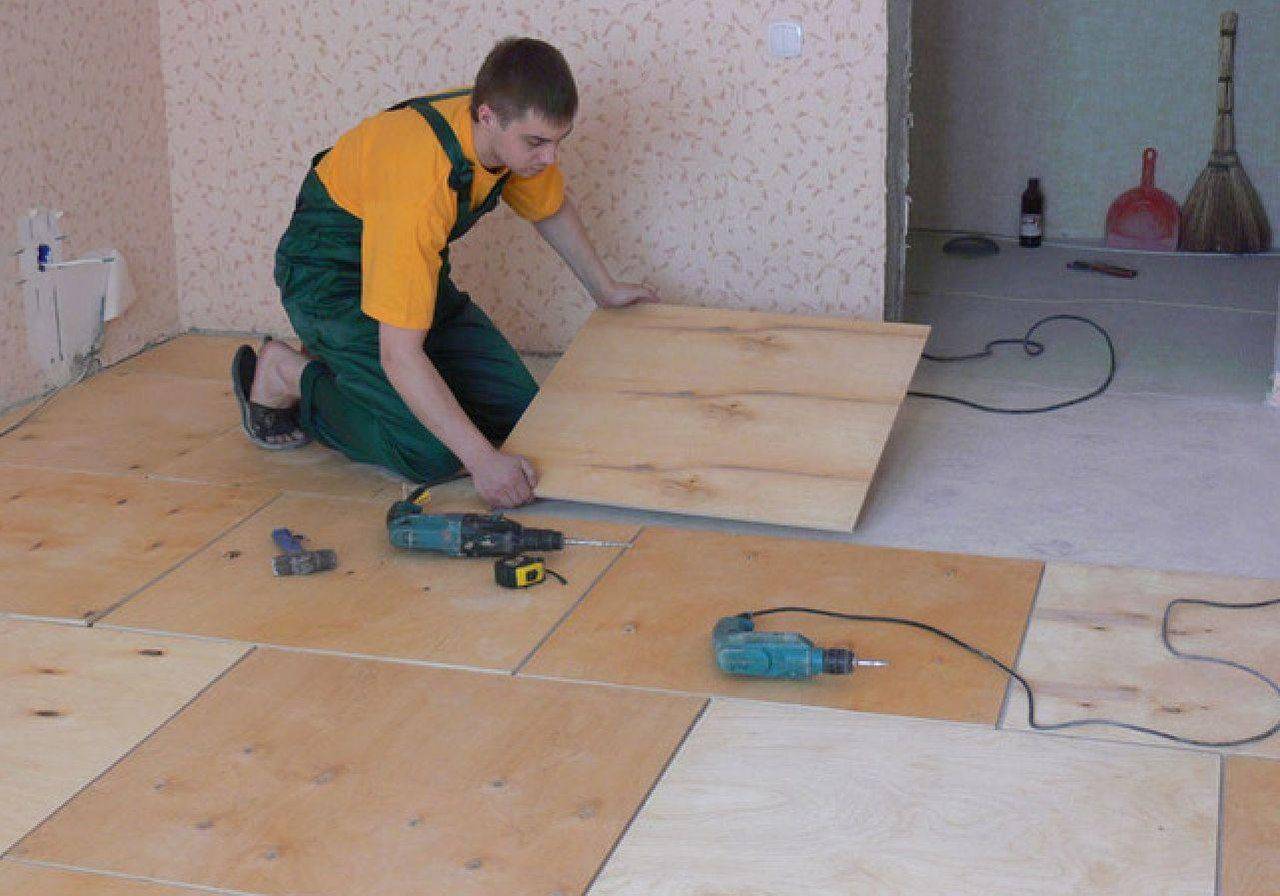 При подготовке чернового пола можно применять многослойную влагостойкую фанеру. Этот материал укладывается в 2 слоя со смещением швов. Крепление проводится саморезами. Зазоры между плитами фанеры должны составлять не менее 1 мм.