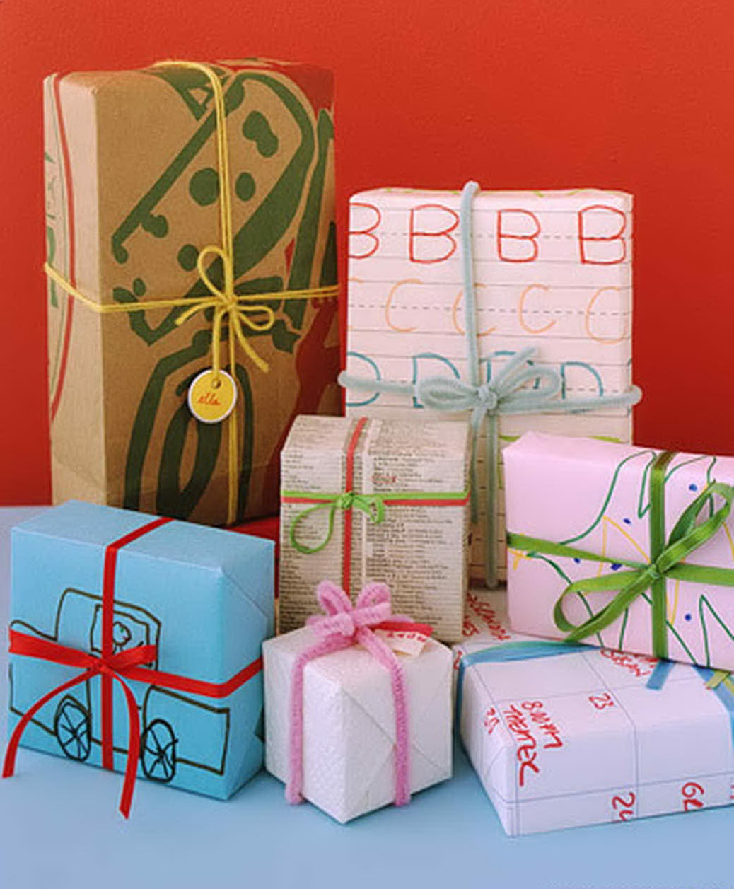 Крафтовая бумага. Похоже, без нее никуда, но это действительно модный, недорогой и симпатичный способ преподнести презент красиво. Таким материалом можно совершенно бесплатно разжиться в любом крупном строительном или мебельном магазине, где его используют для упаковки товаров. Сверху можно приклеить черно-белые фото, отрезки кружева, тесьму, детские рисунки, нарисовать любые узоры или прикрепить засушенные цветы и ягоды, дополнить композицию еловыми веточками, бусинами или пуговицами. Если некогда идти за крафтовой бумагой, можно заменить ее обычной белой, которая станет отличным холстом для воплощения ваших фантазий.