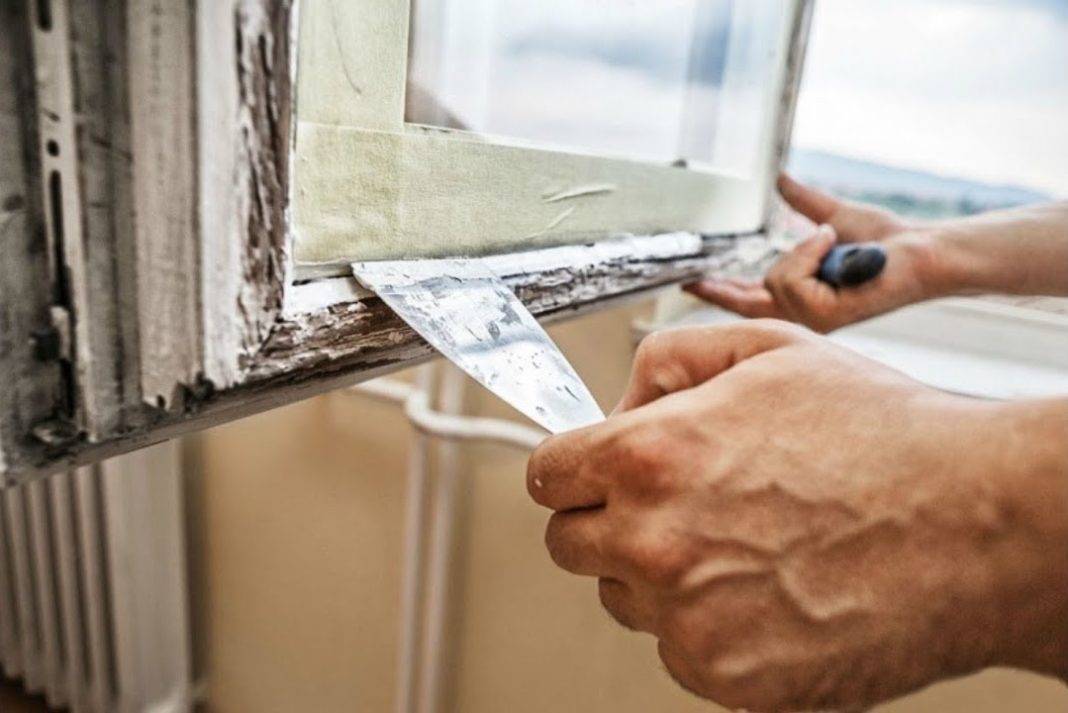 Перед окрашиванием старых деревянных окон необходимо снять с рамы старый слой краски. Для этого используется скребок и наждачка. Если слой не хочет слазить, можно подключить к процессу шлифмашинку или дрель со специальной насадкой. Процедуру очистки нужно проводить очень аккуратно, чтобы не повредить дерево. Для удобства работы фурнитуру с окна лучше снять или заклеить малярным скотчем, а саму конструкцию демонтировать и разместить на горизонтальной поверхности. Стекла также лучше заклеить скотчем по периметру в месте стыка стекла и рамы, отступив пару миллиметров. Это позволит краске попасть вглубь стыка и не оставить проплешин.