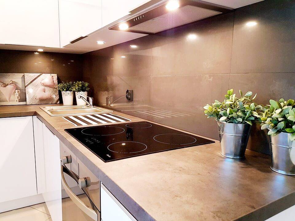 Какой фартук выбрать для кухни? Средней высотой считается 48 – 60 см. Его цель – обеспечение защиты рабочей зоны от загрязнений. Идеальный материал для выполнения данной задачи – керамика.