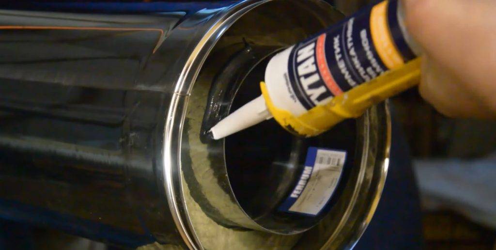 С этой целью используется специальный огнеупорный герметик, который способен выдерживать температуру минимум в 1000 градусов. Нанесение герметика выглядит следующим образом.