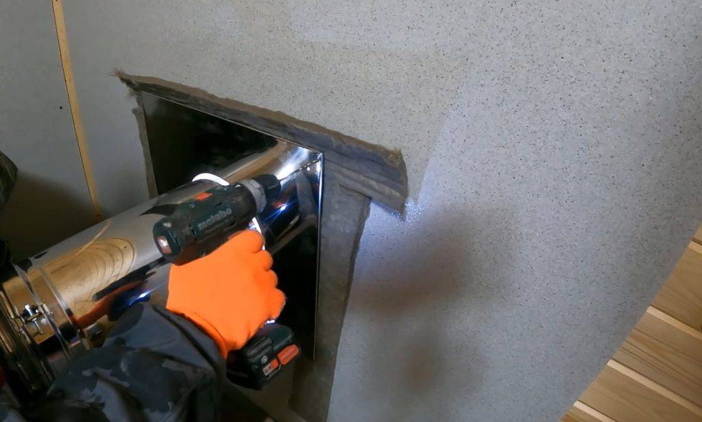 Снаружи прикручивают металлическую пластину, чтобы предохранить деревянную стену от перегрева.