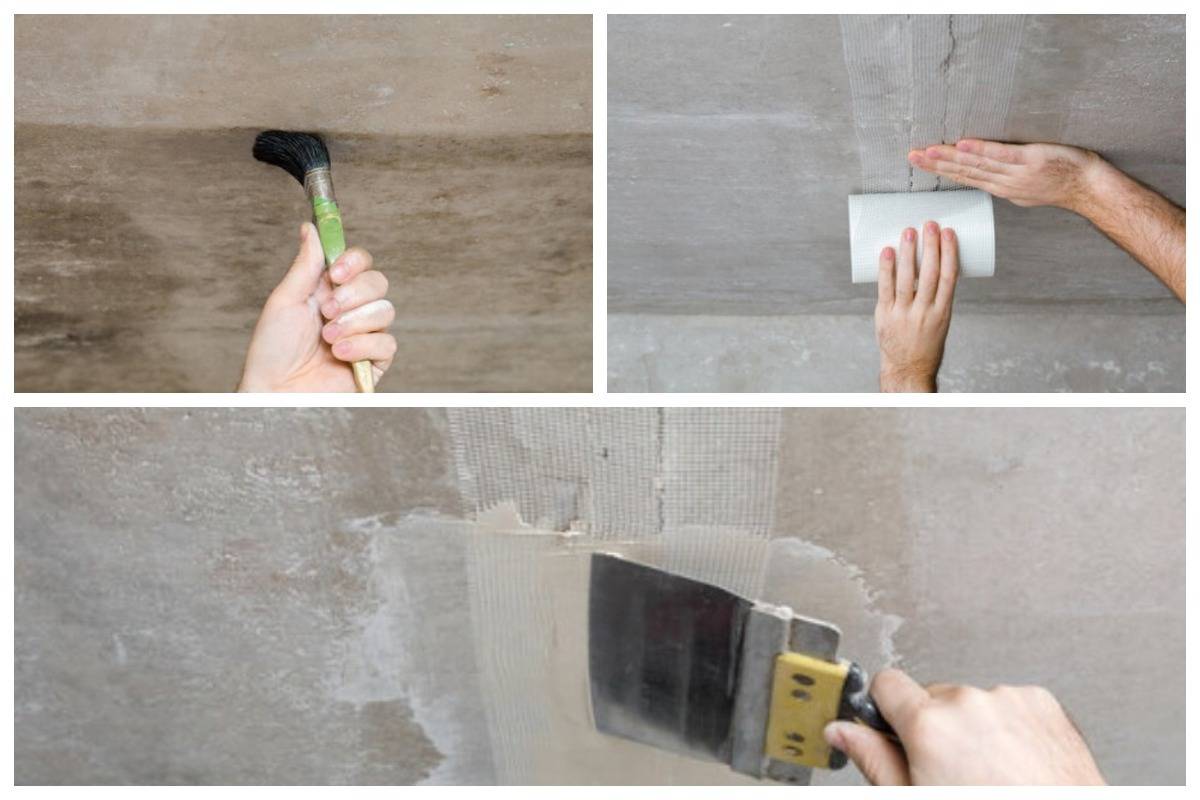 Если трещины на потолке большие, придется действовать по-другому. Такие зазоры дополнительно укрепляют армирующей сеткой-серпянкой, действуя по следующему алгоритму: