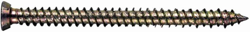 Турбошуруп по бетону (нагель, рамный шуруп) представляет собой обычный саморез. Единственное его отличие – неравномерно нарезанная по высоте резьба. Наконечник – острый. Потайная головка со шлицем, часто выполненным под шестигранник-звездочку (TORX T30) или под крестовую насадку. Чаще всего применяется для крепления рамных оконных и дверных конструкций (бетон, кирпич, природный камень).