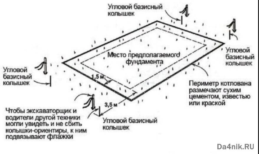 Выполняя разметку под ленточный фундамент, отступают от стен дома на ширину основания. Обычно этот показатель не больше 20 см.
