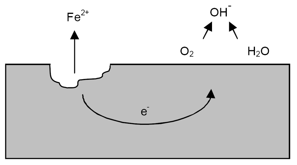 Под действием электролитов (конденсат, дождевая вода и снег, морская и речная, озерная вода, растворы щелочей и кислот, жидкости с высоким содержанием солей) на поверхности металла образуются так называемые гальванические элементы. В зависимости от химического потенциала соприкасающихся материалов металл быстрее или медленнее растворяется. Особенно сильно воздействие коррозии на границе двух металлов – например, в местах установки заклепок на металлический лист или по сварочным швам.