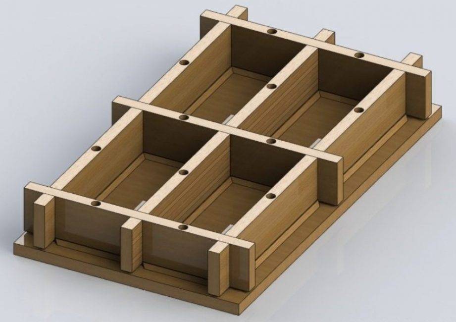 Формы для тротуарной плитки могут иметь разную конфигурацию и размер. С квадратными ячейками справиться даже новичок. Их делают из обычных досок. Прямоугольники собирают из отрезков, длина которых соответственно 30 см и 1 м, а ширина 4 см.