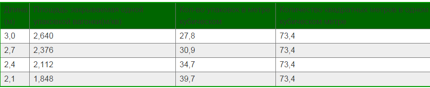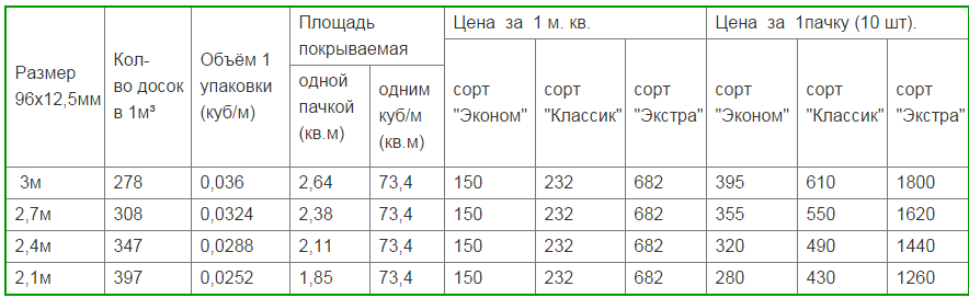 Следующие таблицы помогут узнать, сколько квадратных метров материала в одном кубометре, подсчитать количество упаковок (1 упаковка = 10 панелей вагонки) и определить стоимость обшивки помещения.