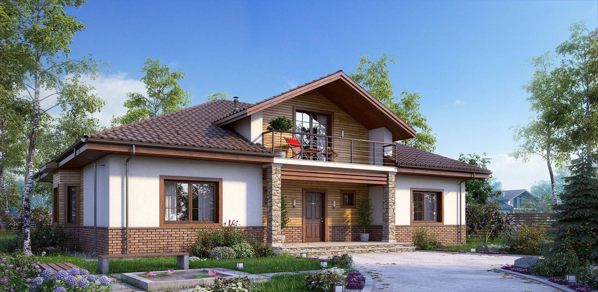 Такой проект дома с мансардой и балконом будет актуален для большой семьи. В таком доме сможет легко поместиться семья, в которой будет четверо или больше детей. На первом этаже предусмотрены все основные помещения, которые должны быть в обычном доме. Есть также и большая терраса для отдыха. Предусмотрено отдельное помещение для отопительных приборов со входом с террасы. Кухня может быть совмещена со столовой и комнатой отдыха, что позволит семье всегда быть вместе, даже если кто-то занят приготовлением пищи. Мансардный этаж имеет общую комнату для общения, две отдельные спальни и санузел. Одна из спален может быть отведена родителям, а другая оборудована для детей. Такой проект требует разумного подхода и правильного расчета, чтобы мансардный этаж не оказывал чрезмерных нагрузок на первый.