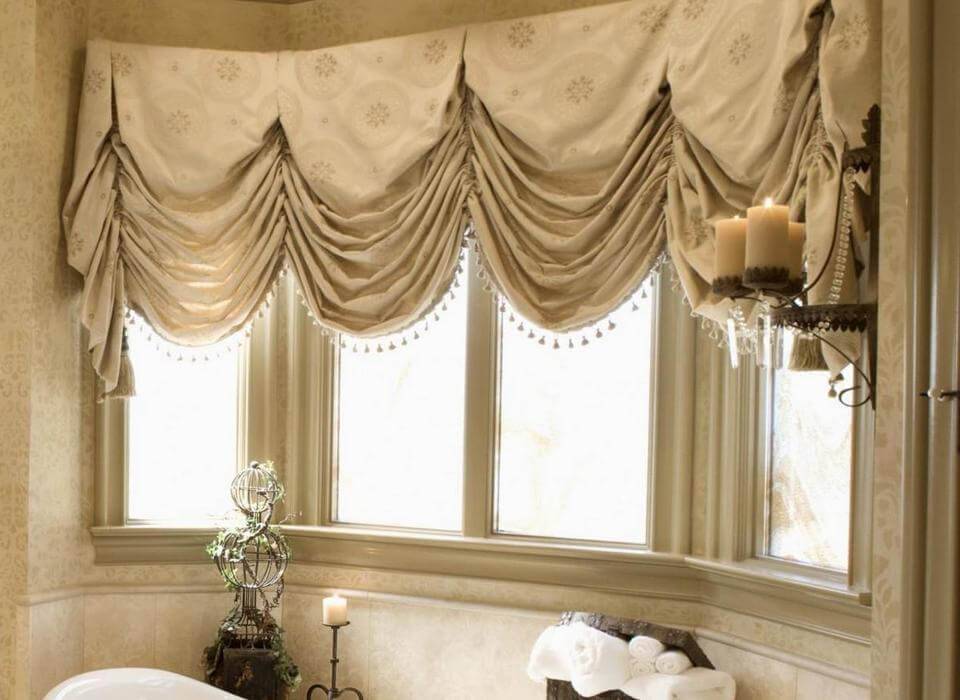 Если окно имеет неправильные пропорции, некрасивую раму – эти недостатки при декорировании следует замаскировать. Низкую и широкую конструкцию можно скрыть, если каждая из штор с драпировкой будет частично заходить на прилегающую стену.