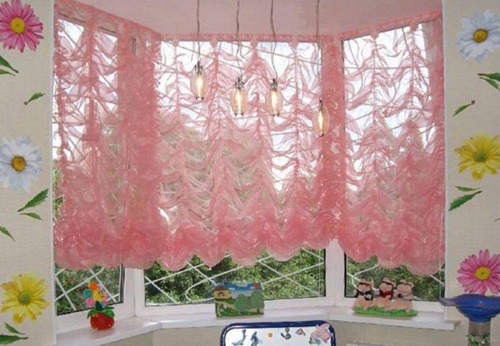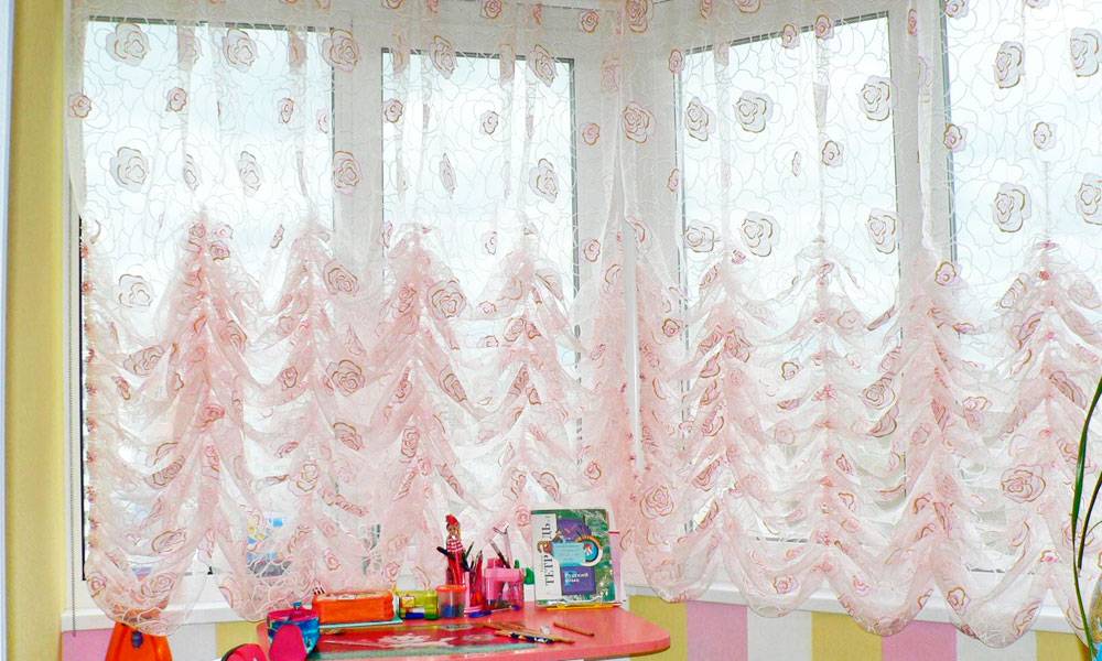 Чередование нескольких окон, образующих выпуклый фасад, важно правильно оформить. Прозрачный тюль с легкой сборкой по-французски идеально подходит для эркера