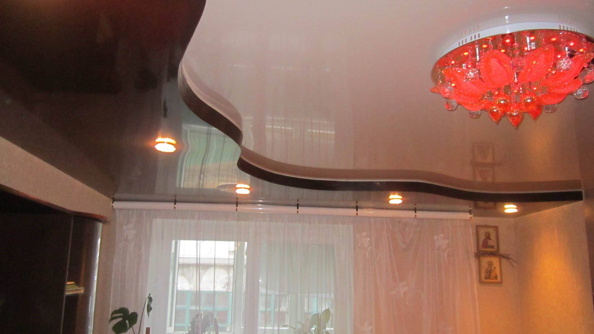 Глянцевую. Также как и предыдущий вид может создавать зеркальный эффект, за счет которого преображает гостиную и делает ее просторнее. Глянцевый материал идет небольшой ширины, поэтому при монтаже будут заметны сварные швы, но для двухуровневых потолочных конструкций они подходят, с помощью них можно изготовить отдельные фрагменты в общей композиции, в которых достаточно будет их ширины. Глянцевая фактура стоит дешевле, чем зеркальная, но имеет более размытое отражение.