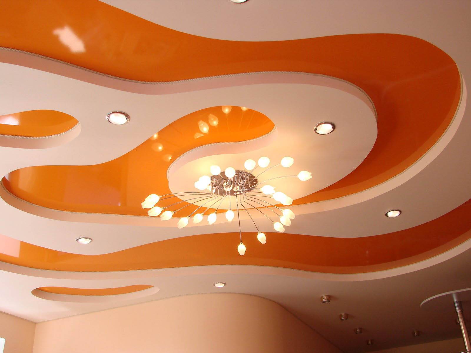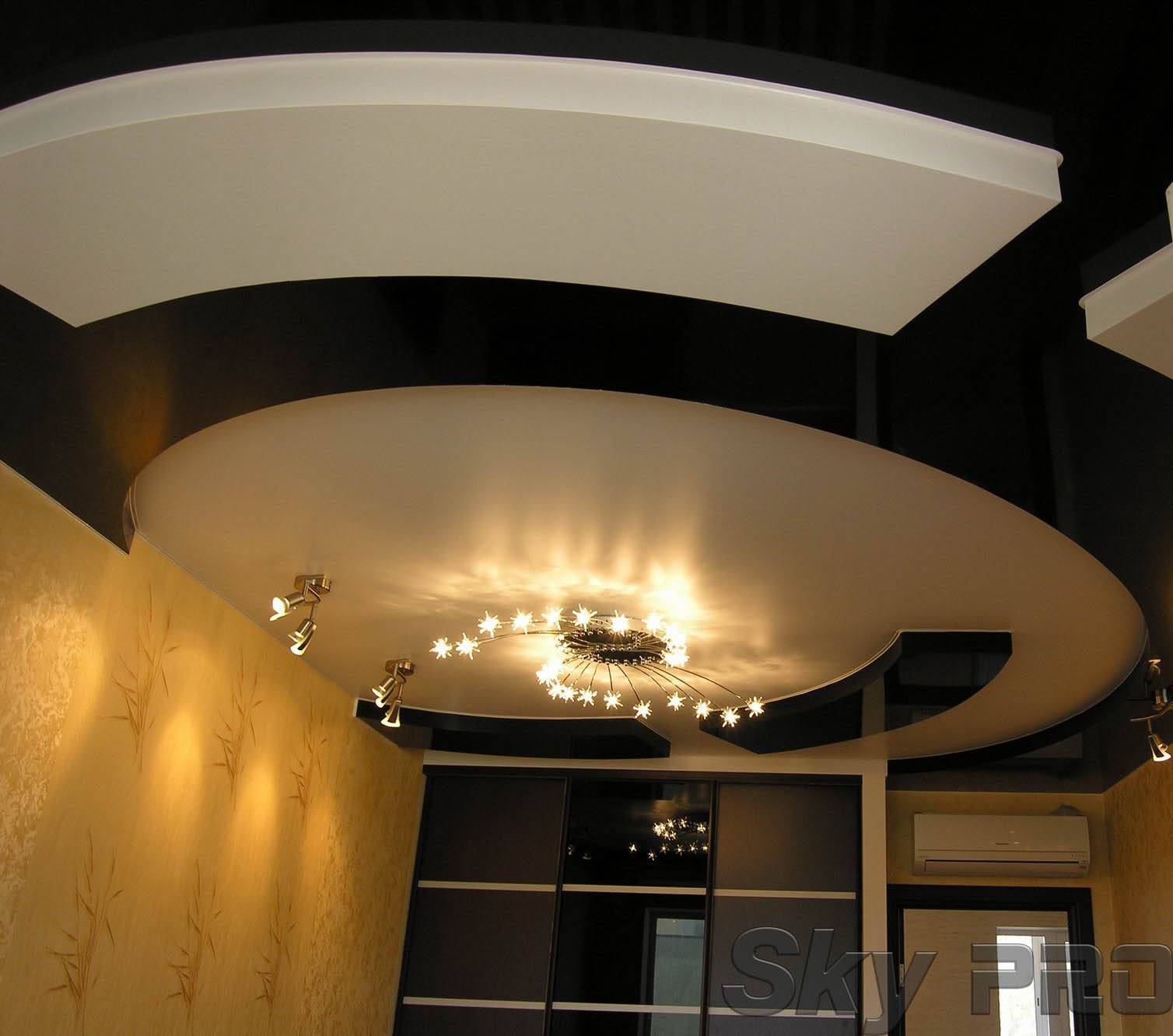Двухуровневые потолки относятся больше к роскоши, хотя сегодня они стоят не так дорого, как это было пару лет назад. Лучше всего реализовать такую роскошь можно именно в центральной комнате вашей квартиры или дома, здесь можно воплотить самые смелые решения. А именно использовать оттенки глубоких контрастов и создать фигуры необычной формы. Чем больше по площади помещение, тем интересней будет общая композиция.