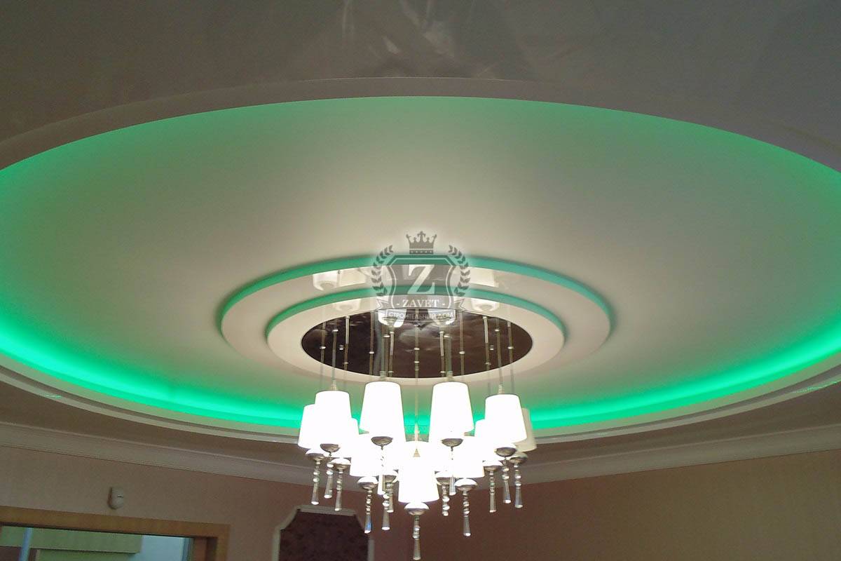 Световые решения с зеленой, оранжевой, желтой, белой или красной подсветкой, делают потолочную конструкцию более изысканной.