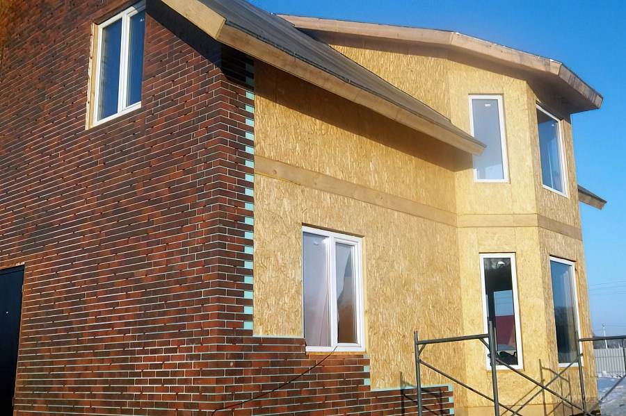 Самый популярный материал для того, чтобы обшить каркасный дом снаружи. Ориентированно-стружечная плита представляет собой несколько слоев склеенной древесной щепы. Причем в каждом слое волокна расположены либо вертикально, либо только горизонтально. В качестве связующего – синтетическая смола, плюс обработка воском.