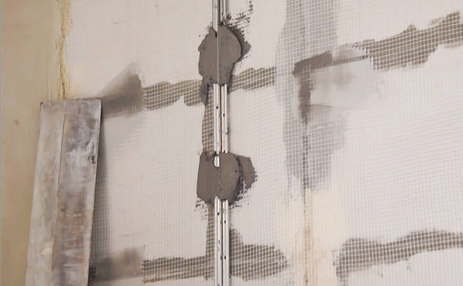 Тщательно замазываем изделие готовой смесью, чтобы добиться прочной фиксации. После чего лицевая часть маяков должна быть обязательно очищена от излишков раствора, так как по ней будет проводиться правИло. От того, насколько часто установлены профиля, зависит удобство и легкость оштукатуривания. Мы рекомендуем делать промежутки не больше 1,5 м.