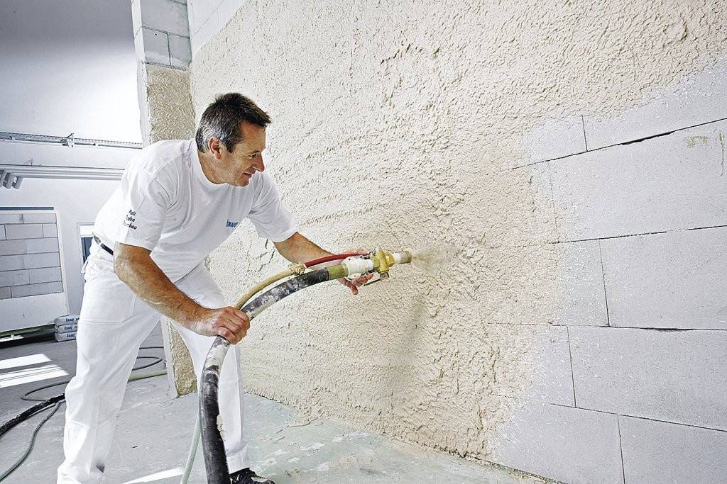 Состав засыпается в специальную штукатурную станцию, которая приступает к приготовлению раствора. После этого мастер наносит смесь на стену с помощью шланга и выравнивает покрытие.