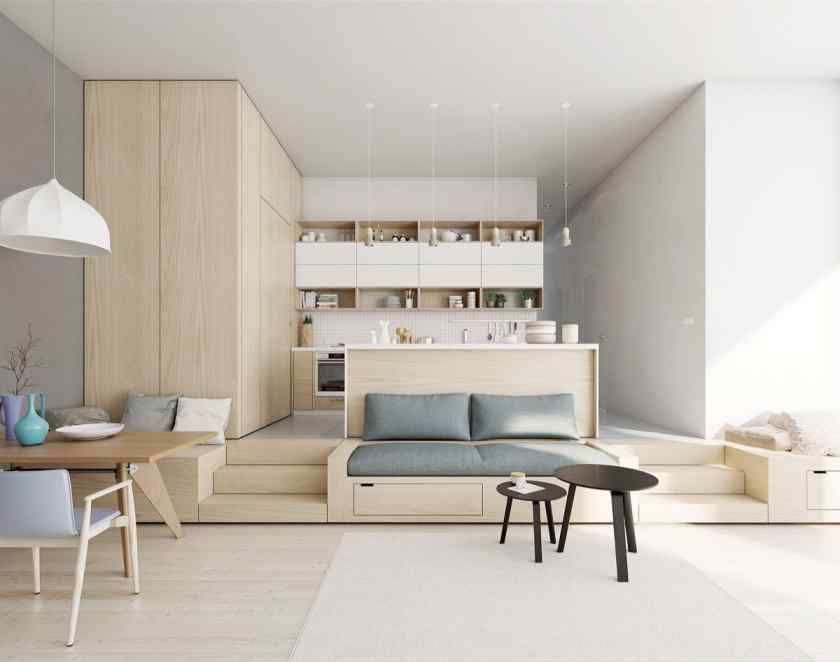 Такой минимализм в городской квартире в буквальном смысле означает простую жизнь. Для этого вида интерьера характерны мягкие оттенки белого и бежевого, плавные линии, приглушенное естественнее освещение. Хотя комнаты выглядят менее строго, чем при других течениях минимализма, основные принципы – функциональность и простота – не нарушаются.