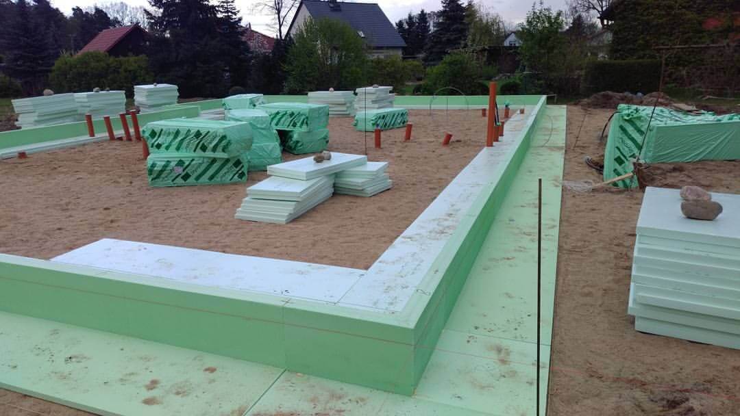 Если использовать западную технологию и перед заливкой бетона уложить в котлован слой песка, а на него – плиты экструдированного пенополистирола, то получите прекрасно утепленный фундамент, которому не страшны морозы и пучение грунта.