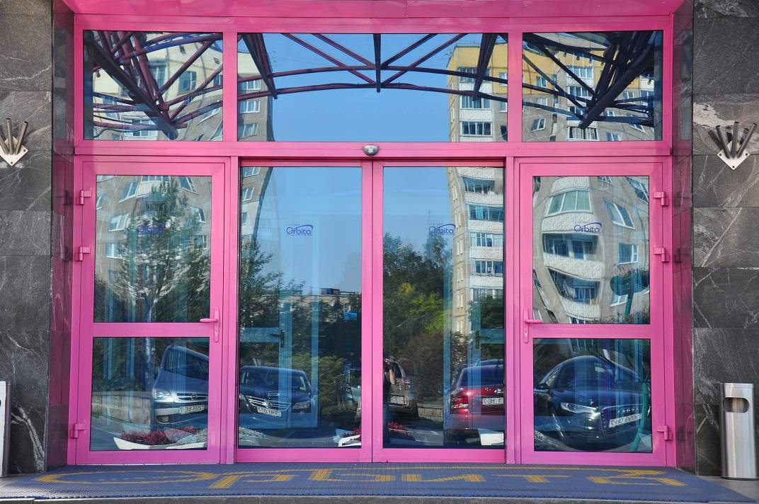 Также широкое применение получили двери из алюминиевого профиля с карусельной системой хода. Их установка оправдана в местах большого потока людей. Использование такого типа конструкций позволяет защитить помещение от проникновения сквозняков и сора.