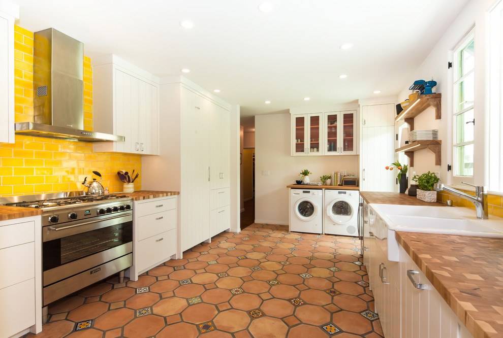 Когда стена фартука рядом с гарнитуром на кухне дополняет напольное покрытие, это сразу же заставляет думать о том, что интерьер был тщательно продуман. Дополнением могут стать еще и шторы, которые тоже можно подобрать в соответствующем оттенке.