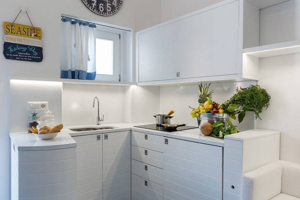 Когда комната довольно маленькая, принято использовать светлые оттенки, даже белый цвет. Если вы тоже его приверженец, то над столешницей на стене лучше закрепить фартук, который будет сочетать сразу несколько оттенков. Это может быть молочный и светло-голубой.