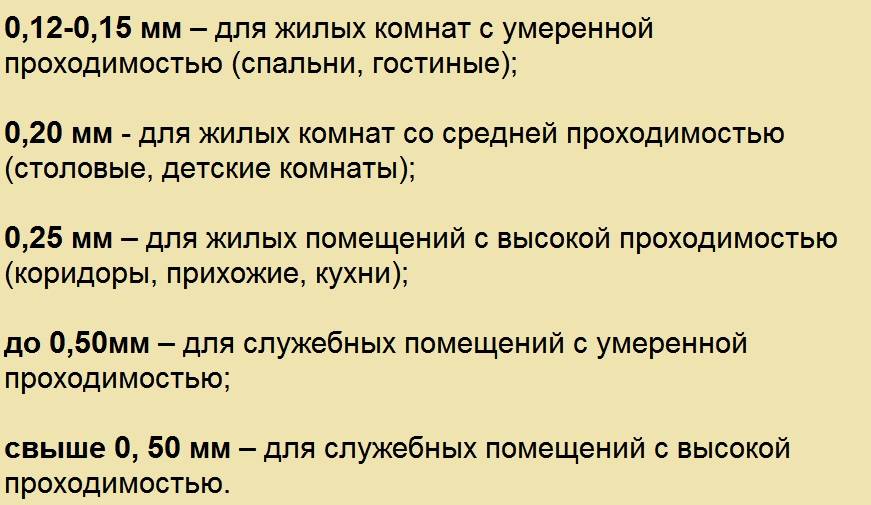 На самом деле покрытия толщиной около 1,5 мм будет вполне достаточно, ведь тут низкий уровень проходимости. Основа покрытия для спальни может быть полиэстеровой или вспененной. Толщина защитного слоя должна составлять 0,15—0,2 мм.