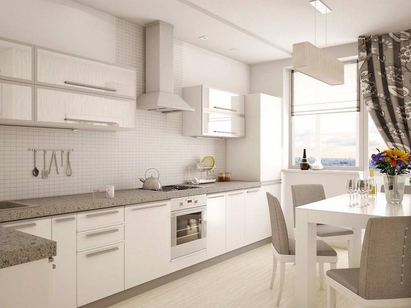 Универсальный вариант исполнения кухни в сером цвете с фартуком из белой плитки. Этот вариант нейтрален, освежить и добавить что-то новое можно яркими цветами, посудой, мебелью. При небольших затратах сил и средств можно легко изменить дизайн кухни.
