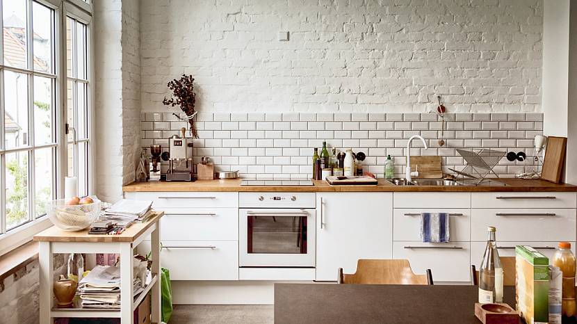 Фартук из керамической плитки белых оттенков подойдет к кухне пастельного или белого оттенка. Дополнить интерьер можно деревянной столешницей, стульями, обеденным столом.