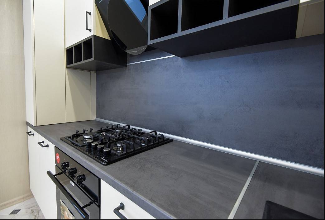 - Сначала стоит рассчитать требуемые размеры. В большинстве случаев высота нужна около 60 см, ведь именно на таком расстоянии размещаются навесные шкафы от столешницы. Стоит оставить около 2 см для захода за столешницу;