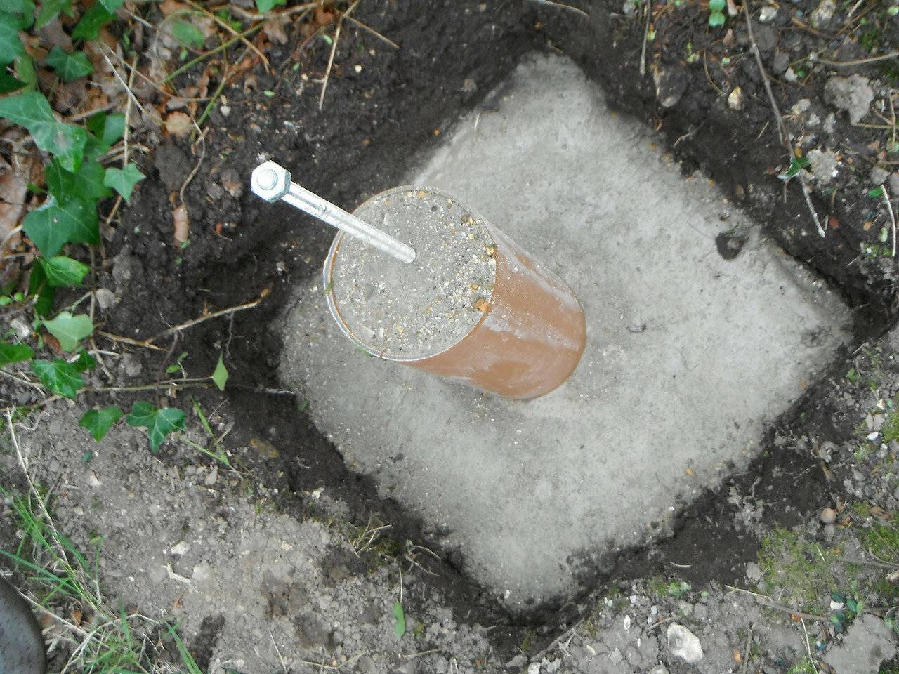 Бетонный раствор (щебень, цемент, вода) заливается в несколько приёмов по 30 см, каждый раз нужно его утрамбовывать методом штыковки металлическим стержнем. После окончания заливки проверяют уровнем монтажный горизонт. Выравнивается по высоте смесью цемента и песка.