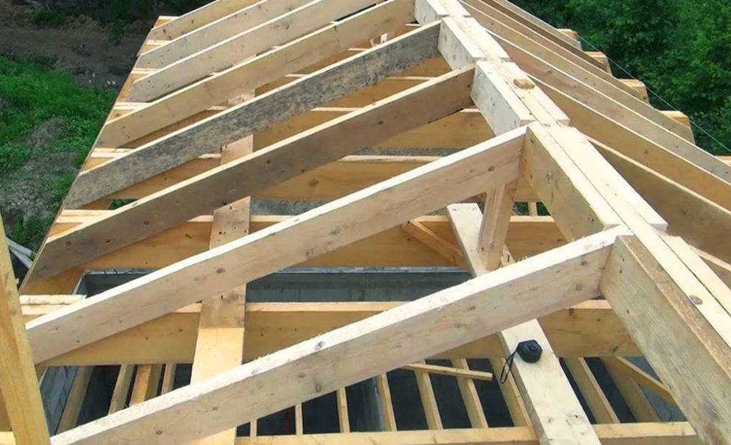 После того, как шаблон приготовлен, по нему надо собрать две пары стропил, которые будут монтироваться по краям. При необходимости ноги наращиваются. Состыковывать их можно вполдерева толстыми болтами или шпильками, что безопасней, или при помощи двух гвоздей, вбитых под разным углом. Между двумя ногами одного стропила надо установить поперечину. После делаются запилы в стропильных ногах в местах примыкания к мауэрлату.