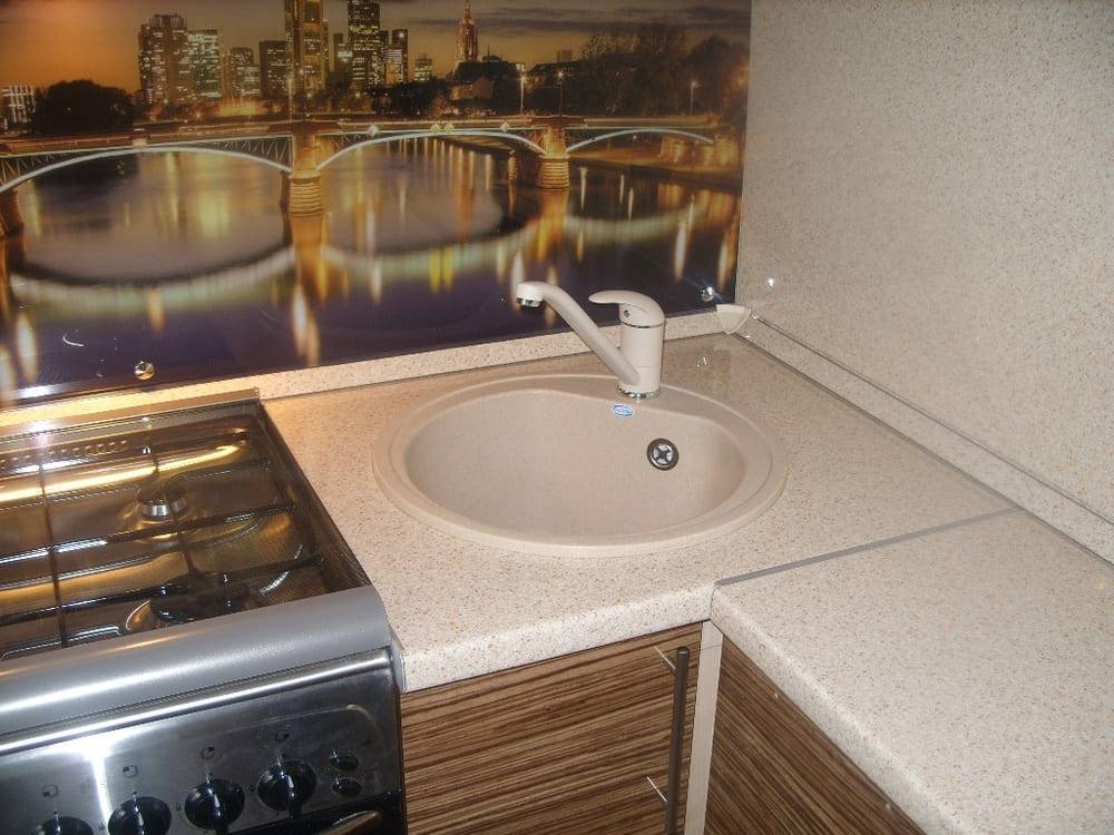 - Врезная мойка, которая «врезается» в столешницу на кухне, иными словами, устанавливается в подготовленное для нее пространство. Специалисты рекомендуют такой способ для длинных столешниц и кухонь. Раковина врезная может ставиться в трех положениях: