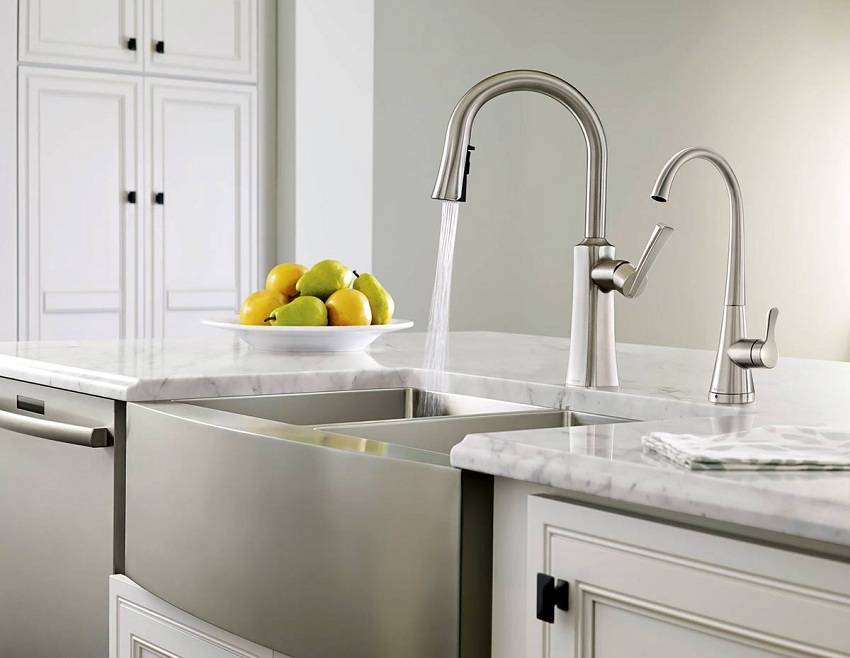Важно заранее определиться и с моделью смесителя. Для неглубокой чаши нужен высокий кран, иначе подсунуть под струю воды кастрюлю будет проблематично