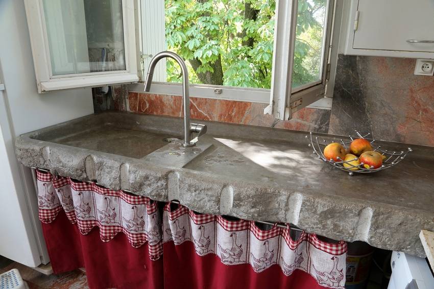 Это дорогостоящие элитные модели, которые выглядят презентабельно и обычно применяются в роскошных дизайнах интерьеров. Изделия изготавливаются вручную из мрамора, оникса, базальта, гранита, травертина. Нередко кухонная мойка из камня представляет собой единую композицию со столешницей.