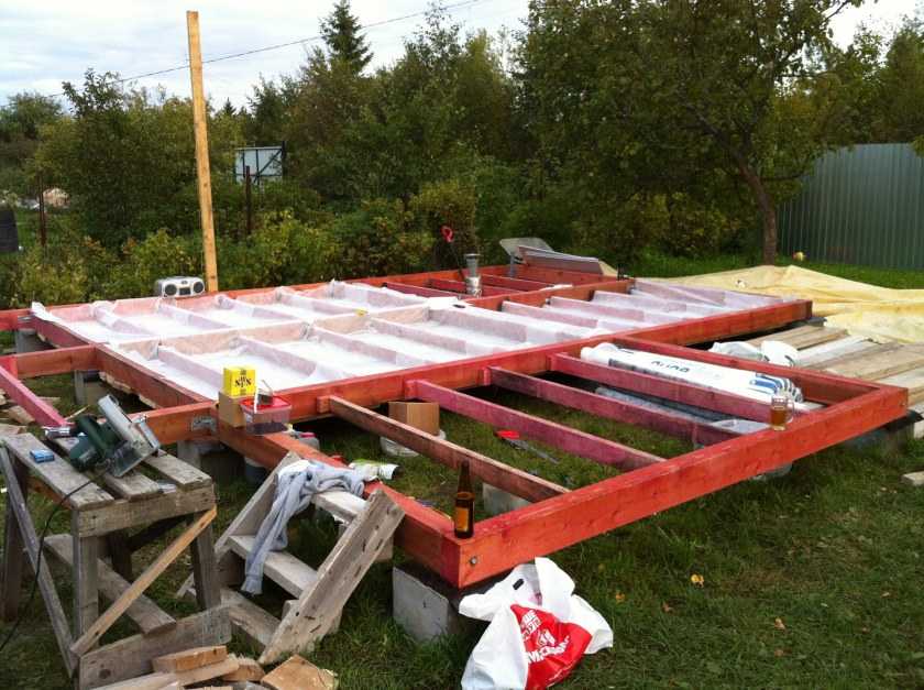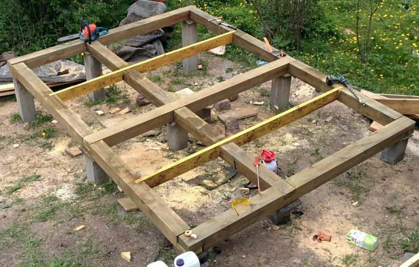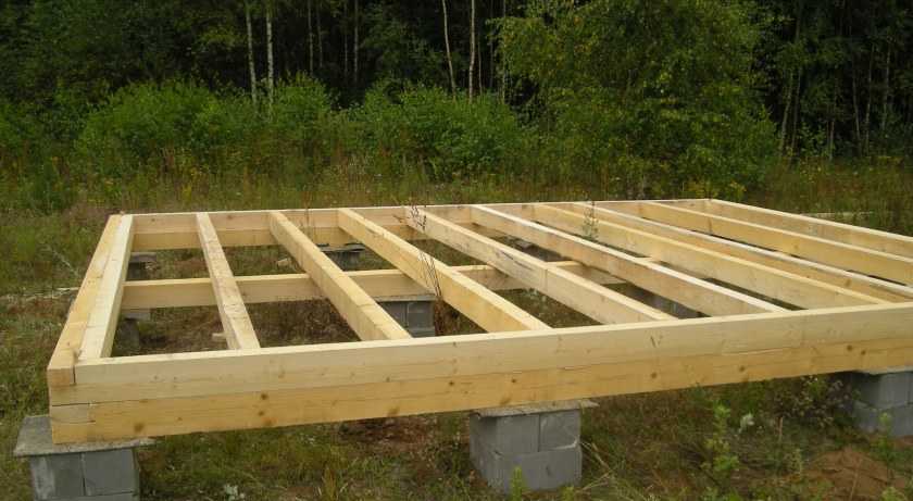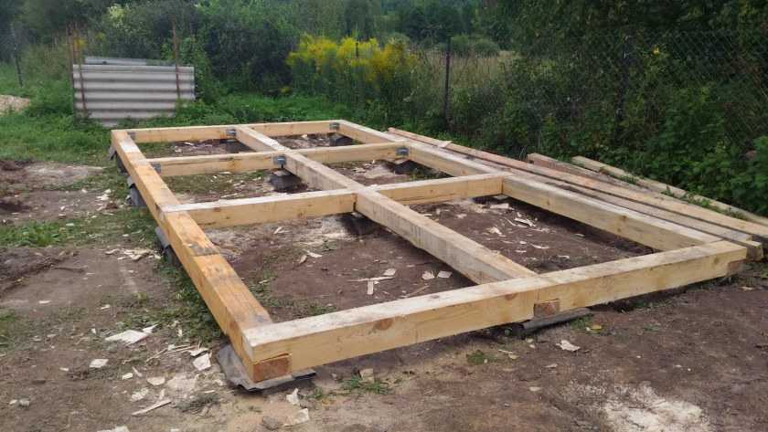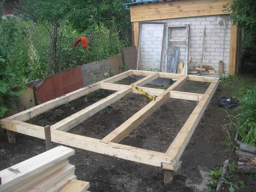 Следующий этап строительства бани – возведение веранды. Для нее потребуется мелкозаглубленный столбчатый фундамент. Далее из доски делают основу, для этого их ставят на торец, так будет исключен прогиб.