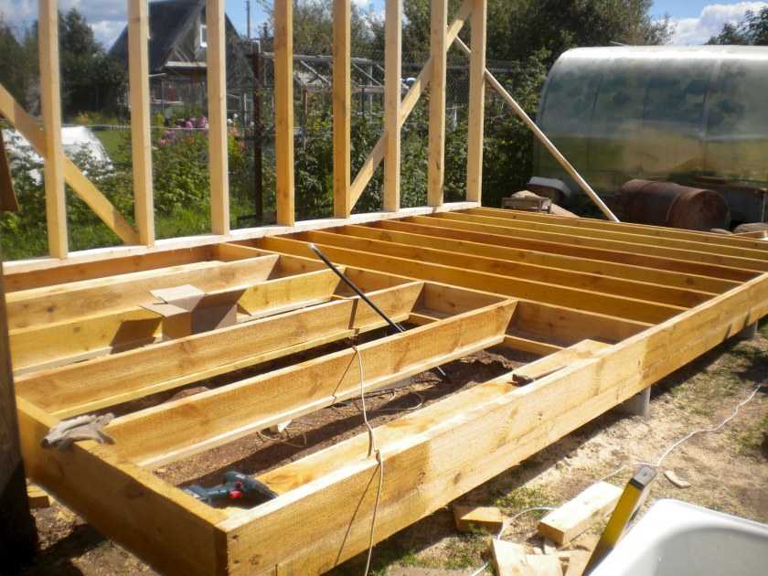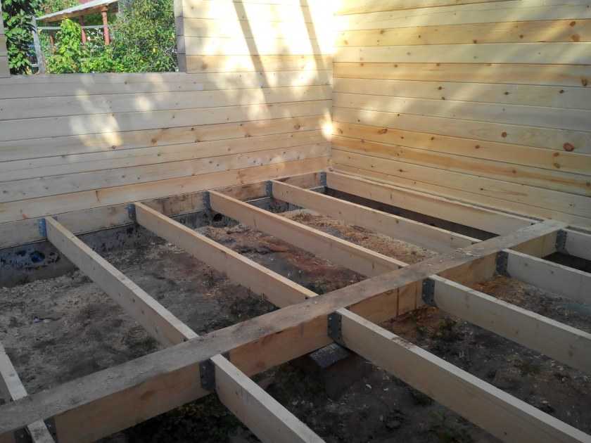 Чтобы лаги не прогибались в процессе эксплуатации, их дополнительно укрепляют промежуточными опорами. Верхняя часть фундамента также гидроизолируется. Далее останется положить доску для пола, начиная от края фундамента. Ее надо обработать антисептиком.