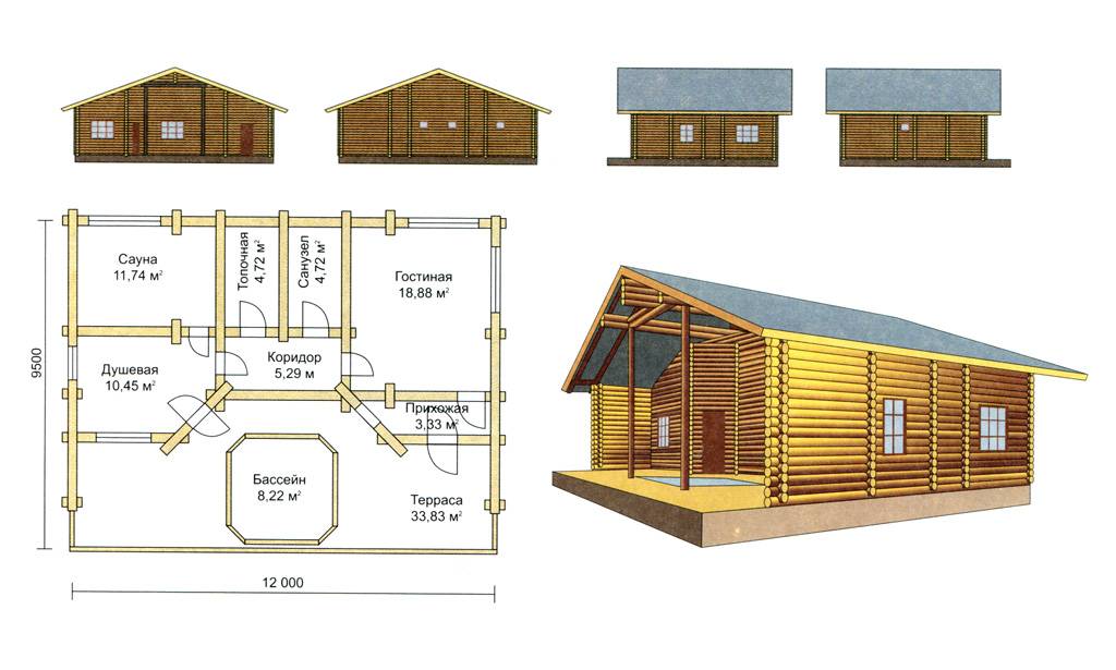 Минимальный размер бани для комфортного пребывания нескольких человек составляет 3х4 м