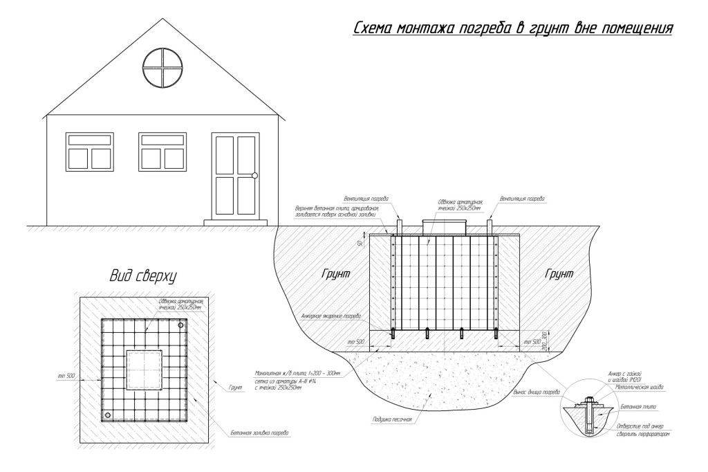Высота металлической конструкции обычно устанавливается на уровне двух метров для нормального передвижения человека. Большие погреба можно выполнить с двумя лазами. Один использовать для загрузки продуктов, второй – для спуска людей. Размеры лазов не должны быть большими, но достаточными для комфортного пользования. В нижней части погреба устанавливают патрубок для сбора грунтовых вод.