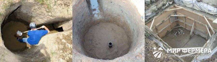 Часто бывает, что в процессе проведения земляных работ в яму просачивается вода. Она поступает из глубинных слоев почвы, но сдерживается глиной, которую убирают в процессе подготовки котлована. Чтобы он не наполнился водой, в центре нужно выкопать отверстие, глубиной примерно на штык лопаты. Оно будет выполнять роль водосборнике и отведет лишнюю воду (рисунок 3).