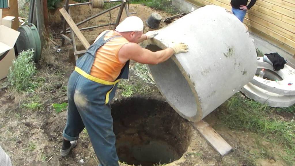 Первый шаг. Выройте котлован глубиной порядка 1 м и установите в него первое кольцо. Лучше, если вам удастся купить кольцо со штырями на нижнем ободке либо же с конусовидным заострением. Такое кольцо будет попросту проще продвигать вниз, и оно осядет под своей же массой.