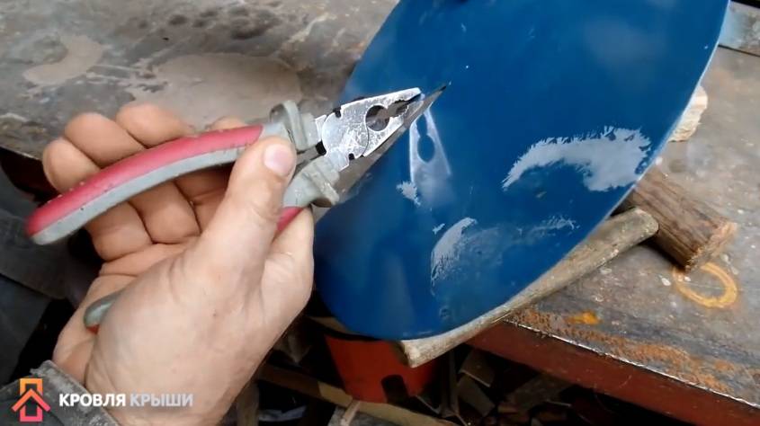 Вырезав заготовку крыши из листа металла, ее надо согнуть таким образом, чтобы получился объемный зонт, и соединить заклепками.