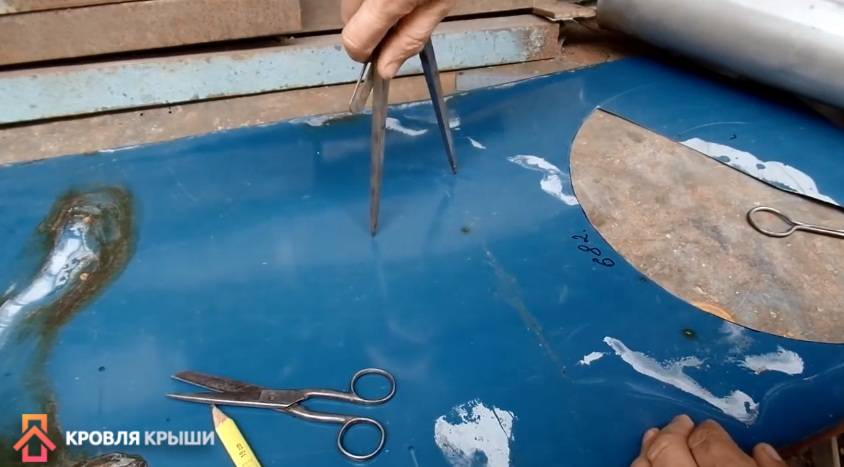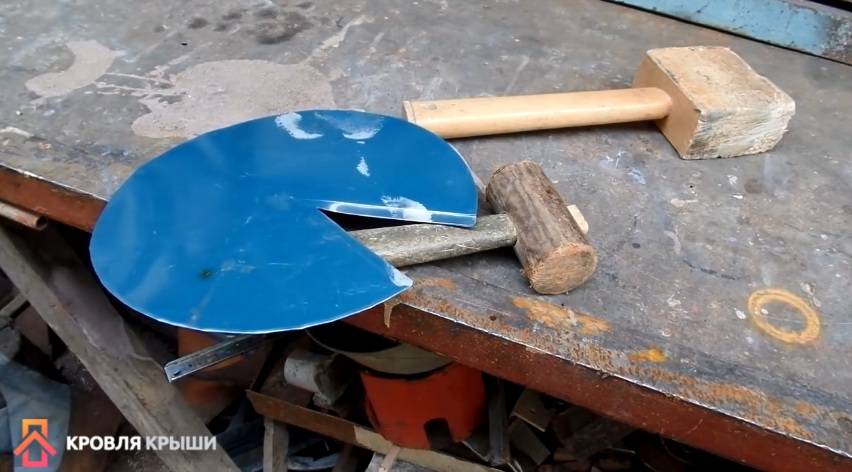 Шаг 1. Определитесь с диаметром колпака. Практики рекомендуют, чтобы его края выступали за периметр трубы не менее чем по 10 см с каждой стороны. Имея это значение можно узнать диаметр круга, который надо вырезать из металла.