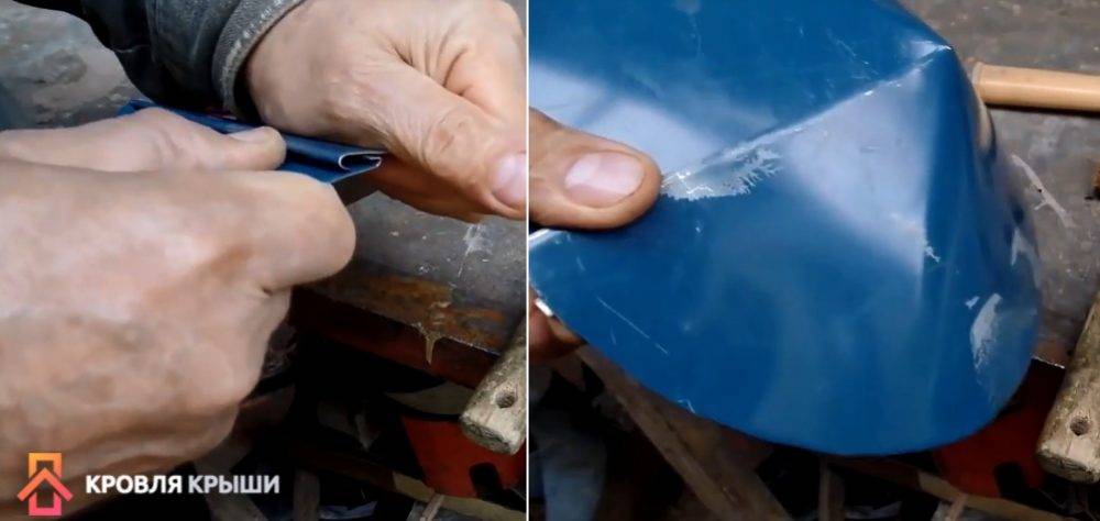 Высота примерно 0,5 см, наворачивание в противоположные стороны. До конца подгибы не сжимайте, это делается на финишном этапе изготовления конуса. Если работать киянкой сложно, то можно сгибать металл обыкновенными пассатижами. Линия получится не такой ровной, но это не имеет значения. Колпак устанавливается очень высоко на дымоходе, с земли такие незначительные проблемы совсем незаметны.