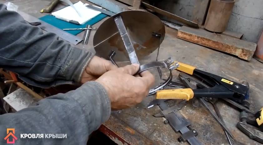 Последний этап – сделайте разметку мест фиксации ножек к колпаку, высверлите отверстия и закрепите элементы. Для крепления лучше пользоваться заклепками. Такими же метизами крепится нижний конец ножек к хомуту. Теперь осталось закрепить колпак на трубе дымохода.