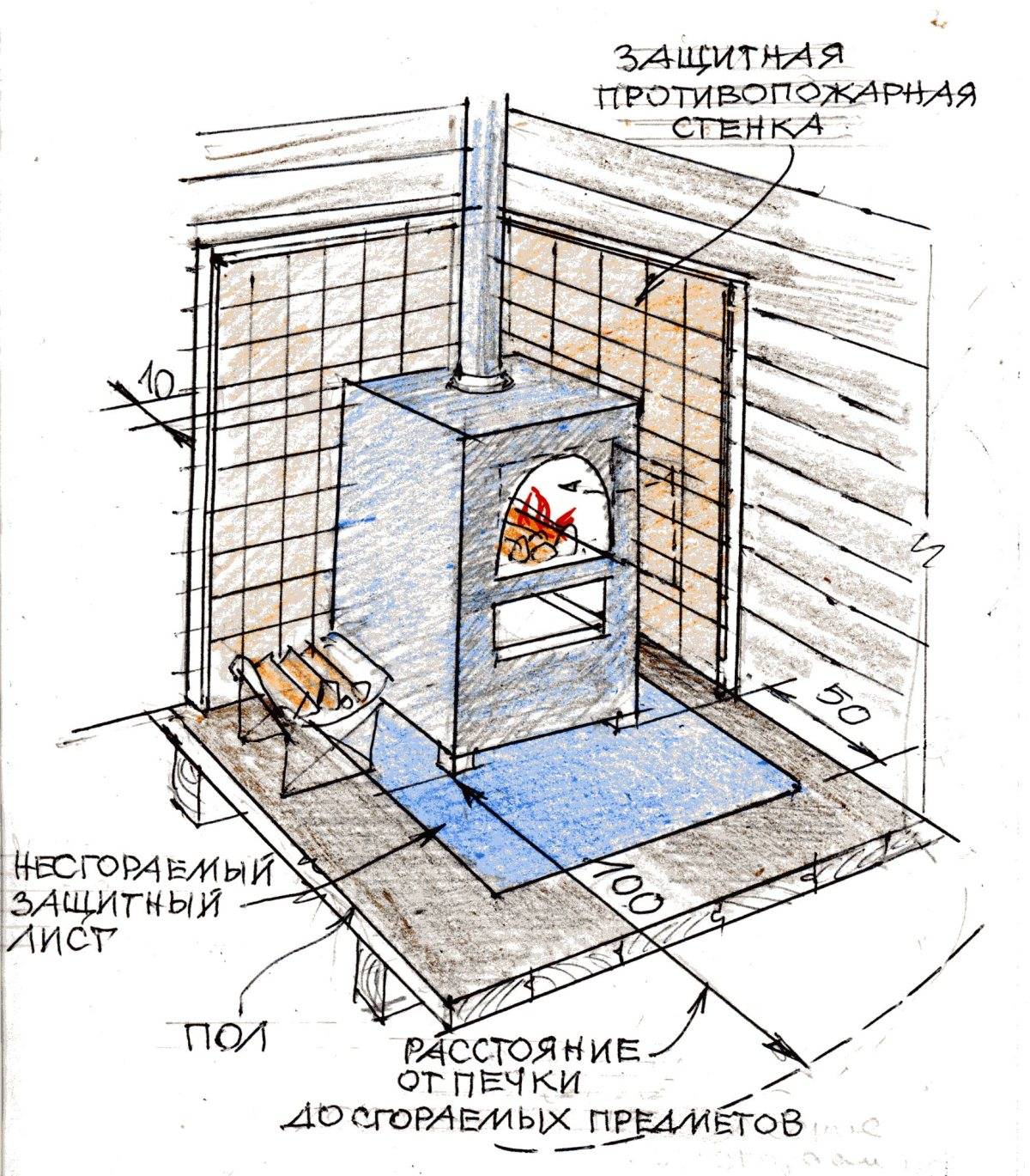 Расстояние от печки до легкосгораемых поверхностей должно быть не менее 50 см. Перед топкой обязательно необходимо уложить лист из металла. Комбинированные печи требуют сооружения дымохода, который должен быть установлен на безопасном расстоянии от деревянных поверхностей и тщательно теплоизолирован.